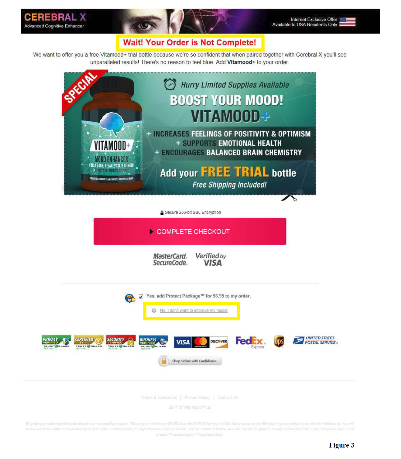 In addition, deceptive advertising led to count for misrepresentation that the order was not complete. After appearing to purchase the initial product, the defendants’ website deceptively notifies the consumer that their order is not complete and it stated that the consumer should add an additional product to their purchase. In Figure 3, I’ve placed a yellow box around the “Order is not complete” statement as well as the “No, I don’t want to improve my mood” link. This offer was initially deceptive because the first order was actually completed and processed. By clicking the faint grey “No, I don’t want to improve my mood” link, a consumer would think that they are declining the additional product. According to the complaint, the “No, I don’t want to improve my mood” link took consumers to additional deceptive ads for similar products.